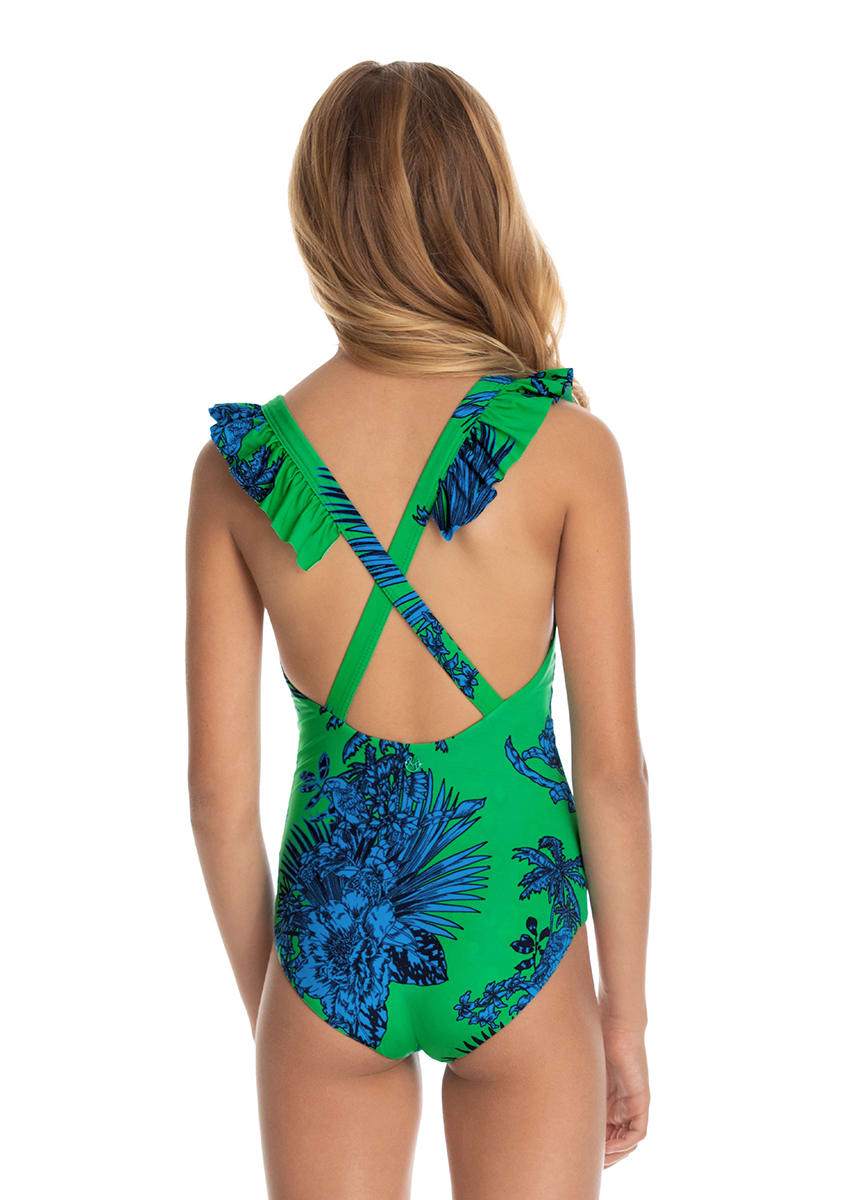 Let’s go take a stroll by the shore to find shell-shaped treasures. Their magical colors will complement the ones in the Big Top Tropicus one-piece swimsuit. Ruffle over the shoulders and crisscrossed straps at the back, this one-piece swimsuit has a tropical print and is lined with a custom Maaji print. Pair it with other pieces in the Under The Big Top Collection.
