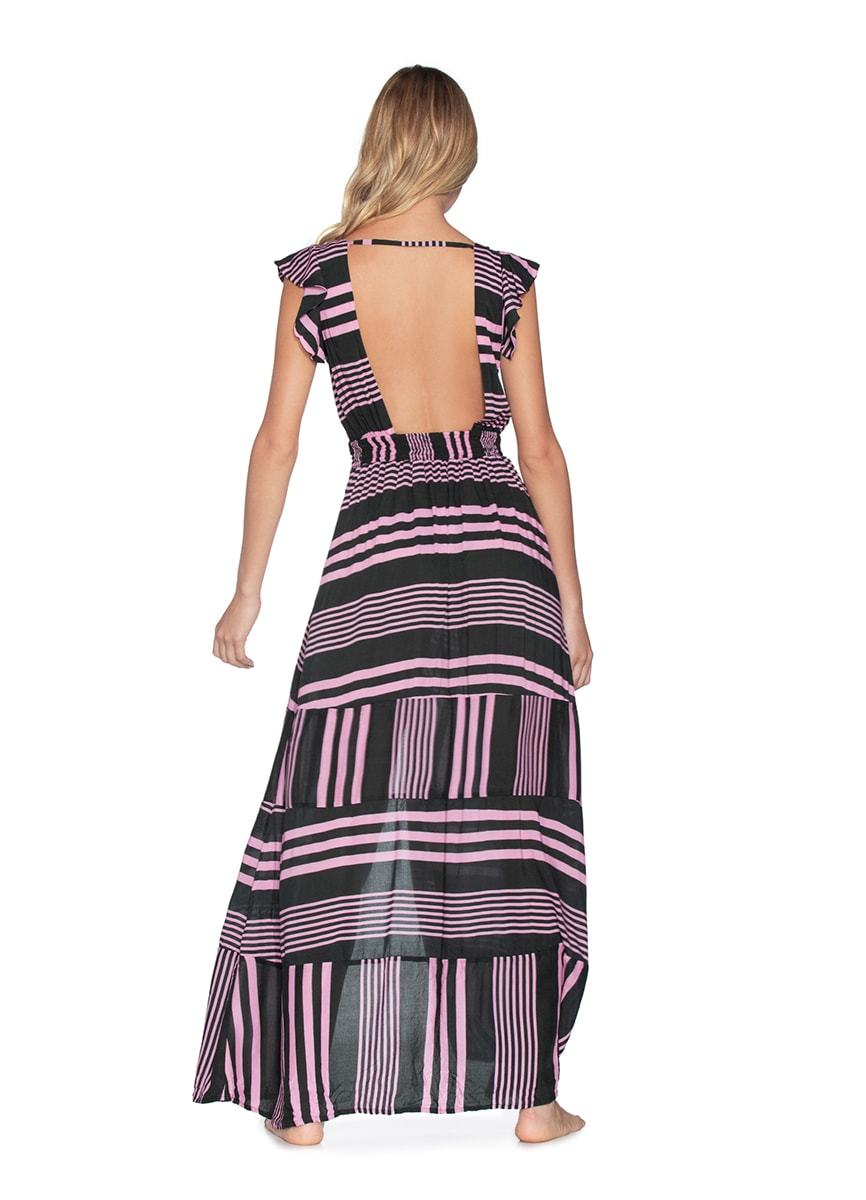 Summer parties under the stars call for Discovery. This long beach dress features a plunging neckline, open back, front slit, and ruffle sleeves. You’ll be able to dance the night away wearing this flowy floor-length dress. It’s made of a soft lightweight fabric in a tropical leaf print. Pair it with swimsuits from the Ocean Depths Collection.