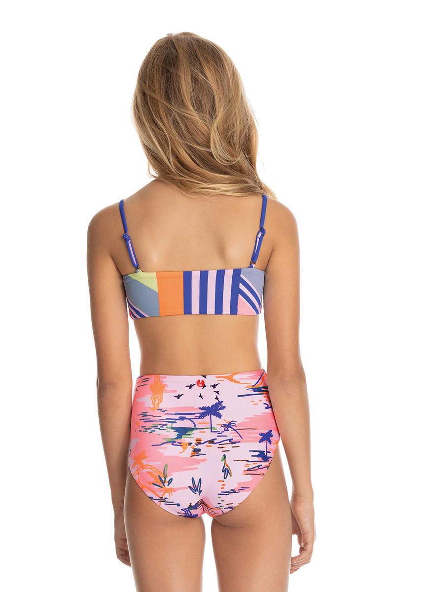 Kaleido-Circus is a genuinely unique one-piece swimsuit. The top and bottom join at the center front, allowing you to twist or reverse the top or bottom, creating four suits in one. The hardest part of your day will be choosing which patterns to pair up! The midriff-baring swimsuit features a bandeau line, high waist, and full coverage. Pair it with cover-ups from our Rainbow Carousel collection.